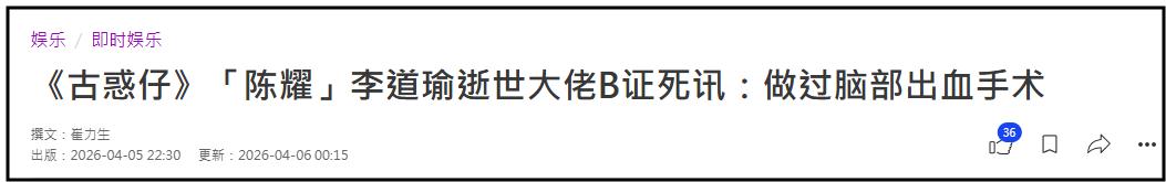 **吃瓜简评:明明就该早点去世的港星李道瑜,终结了自己的人生剧**,在这生死无常的世界里,谁又能说明天不可能就此而终?而李道瑜,这位曾经风靡一时的港星,竟在58岁时,走上了人生的最后一幕,一个看似平常的醉酒意外,却让这位“陈耀”的原型彻底从荧幕上消失,留下了无数的遗憾和唉叹。,说到李道瑜,很多人都会想起那个西装革履、戴着细框眼镜的冷静杀手——陈耀。《古惑仔》中的他,风雨无阻,权谋深沉,简直是港片中不可撼动的顶级高手,但谁曾想,这位“白纸扇”在现实中却像只鸽子一样,撞到了自家的大树,酿成了一场注定要死的醉酒摔倒事故。,李道瑜的一生就像一部乱七八糟的港片,他从艺开始时,像一粒尘埃一样无名无姓,直到1996年在《古惑仔》中一炮而红,但即便在巅峰时期,他也没有好好珍惜,选择了转向商业领域,过起了低调隐世的生活,可以说,他就是一位“隐世高手”,在商场上摸索前行,却始终未能忘怀表演的血脉。,2008年,他在《我老婆是赌圣》中演出了最后一部电影,之后便彻底淡出娱乐圈,开始了一段低调的经商生活,然而命运似乎总是偏爱给他开玩笑,2023年,他在TVB剧《一舞倾城》中重返荧幕,饰演了一位风风火火的大律师,看起来,他似乎找回了人生的滋味,开始了新的演艺生涯。,就像一场注定的悲剧,2024年,他在和东北朋友聚会后,喝得烂醉,回家途中摔倒撞到后脑,导致严重的脑出血,经过六天的昏迷抢救,他最终还是没能走出生命的最后一战,他的家人在他住院期间发布了许多照片,显示出他从帅气的中年男子,到病态的重病患者,变化之痛快到了让人心疼。,这位曾经风靡一时的港星,居然在人生最后时刻还被网友们称为“戏精不死,真人就死”,这句话听起来像是在调侃,但对于李道瑜来说,实在是太真实了,他的去世让我们看到了明星之所以“明星”的一面——他们的生活和命运,往往比普通人更加戏剧化。,李道瑜的悲剧也提醒我们,生活中的每个人,都是自己命运的编剧,无论是醉酒、吸烟,还是其他危险的生活方式,都可能在不经意间,剥夺我们与家人共度的时光,或许我们可以从他的遗憾中吸取教训,学会珍惜健康,远离危险的生活习惯。,李道瑜的一生就像一部乱码的港片,充满了戏剧性的转折和悲剧性的结局,虽然他未能走出人生的最后一幕,但他的经历却让我们看到了生活中那一抹无法预知的无常,或许这就是命运的游戏,有的人走得早,有的人则要留在生命的舞台上,直到最后一幕。《古惑仔》耀哥陈道瑜,咦?不对,应该是李道瑜!这位曾经风靡一时的港片大师,居然在今年58岁就离开了人世,这简直让所有70后、80后、90后都怀念起了自己的青春!,李道瑜,一个原本可以成为“一生骄傲”大师的男人,竟然在2024年的一场醉驾事故中撞到后脑,昏迷6天,最后在4月5日不幸离世,从“白纸扇”到最后的“半头凹”,这位曾经风流倜傥的港星,竟然在人生的最后时刻变成了一个与往日判若两人的人。,想想李道瑜的人生,简直就是一部传奇剧!从艺训班毕业后,他尝试过电视剧,但没什么起色,转向电影领域后,终于在1996年的《古惑仔》中大放异彩,塑造了“陈耀”这个经典角色,他总是西装革履,戴着细框眼镜,气质冷静,城府深沉,仿佛带着一股无形的霸气,哪怕是在赌桌上与金城武对峙,他的眼神中都透着一股说不出的锐气,简直是“一人之下,万人之上”。,随着港片的式微,李道瑜也逐渐淡出娱乐圈,转型经商,过着低调的生活,尽管如此,他对表演的热爱却从未减弱,2023年他还回归 TVs《一舞倾城》,饰演了一位大律师,这让观众看到了他在演技上的再突破,就在大家期待他带来更多精彩作品的时候,一个意外的醉驾事件,彻底改变了他的命运。,李道瑜的好友吴志雄证实了这场悲剧的真实性,透露他是在4月3日醉酒摔倒,导致半个头凹了脑,做了开颅手术,尽管经过抢救,他最终还是离开了我们,有朋友晒出的住院照显示,李道瑜此时已经瘦到几乎认不出,满头白发,右脑凹陷了一块,和当年的风流小子简直判若两人。,作为一位未婚的单身汉,李道瑜的后事由他的哥哥从加拿大飞回香港处理,这无疑让人感叹人生的无常,他的朋友们纷纷发文悼念,回忆起他在荧幕上的辉煌,以及他低调生活中的温暖。,或许可以说,李道瑜的一生就像他在《古惑仔》中的角色一样,虽然最后的结局不如意,但他依然留下了属于自己的传奇色彩,他的遗作和经历,会让一代代观众对港片有更深的怀念。,李道瑜的离世也提醒我们,生活中的每一天都要珍惜,远离醉酒和不良习惯,好好守护自己的健康,毕竟,生命是最宝贵的财富,任何不负责任的行为,都可能让一段美好的生活彻底终结。