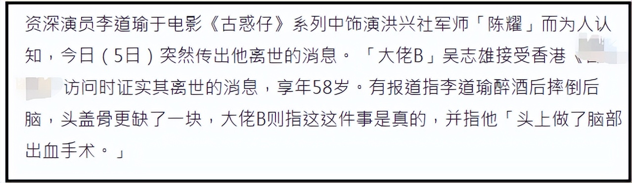 对于此事是否真实,吴志雄也证实是真的,他说李道瑜醉酒摔倒撞到后脑,做了脑部出血手术。