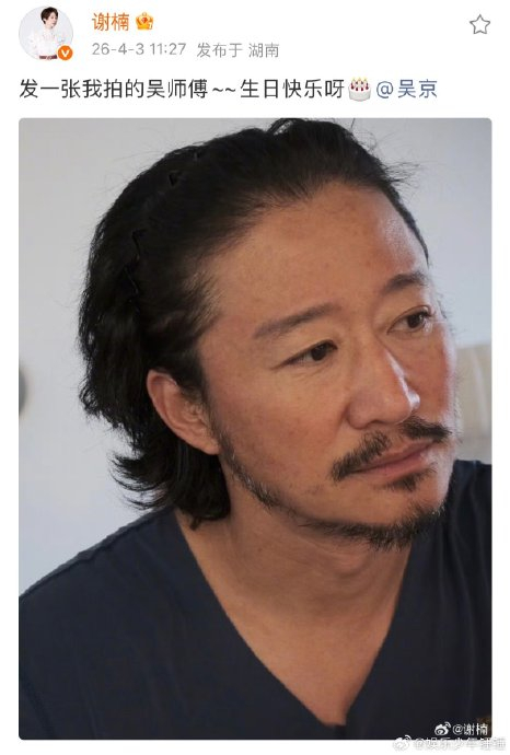 2026年4月3日11时27分,谢楠在微博晒出一张亲自拍摄的吴京写真。照片中,蓄起长发的吴京倚墙而立,胡茬微泛,眼神深邃如暮色中的远山,罕见地褪去了银幕硬汉的凌厉,尽显松弛与故事感。他转发回应:“谢谢谢摄影师,辛苦训练也要注意休息噢”——寥寥数语,既是庆生的甜蜜,亦是对参加《乘风2026》的妻子隔空叮嘱。这一天是吴京52岁生日,也是这对夫妻相识十四载、婚姻第十二年的寻常一日,而这张“吴师傅”写真背后,藏着一段始于年少倾慕、成于患难相守的情感史诗。