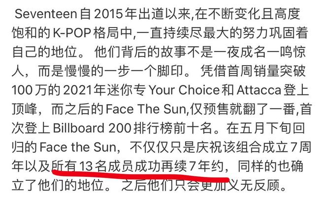 根据韩媒报道,seventeen十三人全员续约7年,外国line7年,韩国line5年+两年服役,这应该是最有团魂的团吧,是次粉感动到飙泪的程度吧,完全不用担心陆续服役导致团散掉了。永远会被Kpop真诚的热血笨蛋打动!