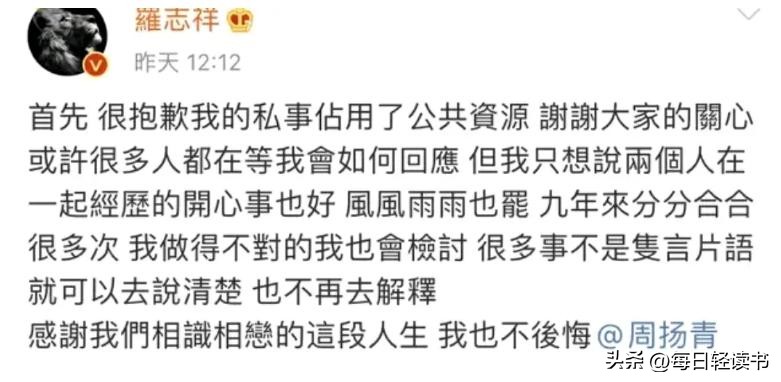并且这次分手闹得两人十分不体面,周扬青直接在自己的社交账号上发布了一篇长文,控诉罗志祥。