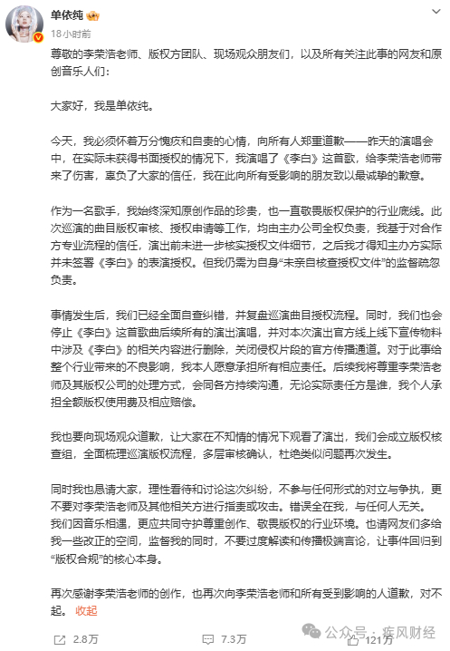 3月30日凌晨1点08分,单依纯发布长文,态度发生180度转弯。她承认此次翻唱的版权由主办方负责对接,本人未亲自核实授权情况,“实际并未获得书面授权”。她宣布:后续永久停止演唱《李白》,删除所有相关宣传物料,个人承担全额版权使用费及相应赔偿。