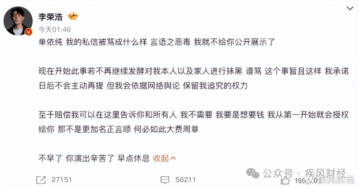 仅仅38分钟后,凌晨1点46分,李荣浩迅速回应。但他的回应重点既不是版权也不是赔偿,而是直接亮出了自己承受的网络暴力:“我的私信被骂成什么样,言语之恶毒,我就不给你公开展示了。”他给出明确警告:“现在开始,此事若不再继续发酵对我本人以及家人进行抹黑、谩骂,这个事暂且这样,我承诺日后不会主动再提。但我会依据网络舆论,保留我追究的权力。”至于赔偿,他态度坚决:“我不需要。我要是想要钱,我从第一开始就会授权给你。”