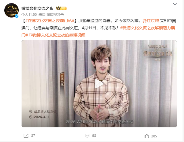 所谓“退圈后首露面”,实为事件发酵后的正常公开动态。4月2日,微博文化交流之夜发布动态——那些年追过的青春,如今依然闪耀。@汪东城 亮相中国澳门,让经典与潮流在此刻交汇。4月11日,不见不散!