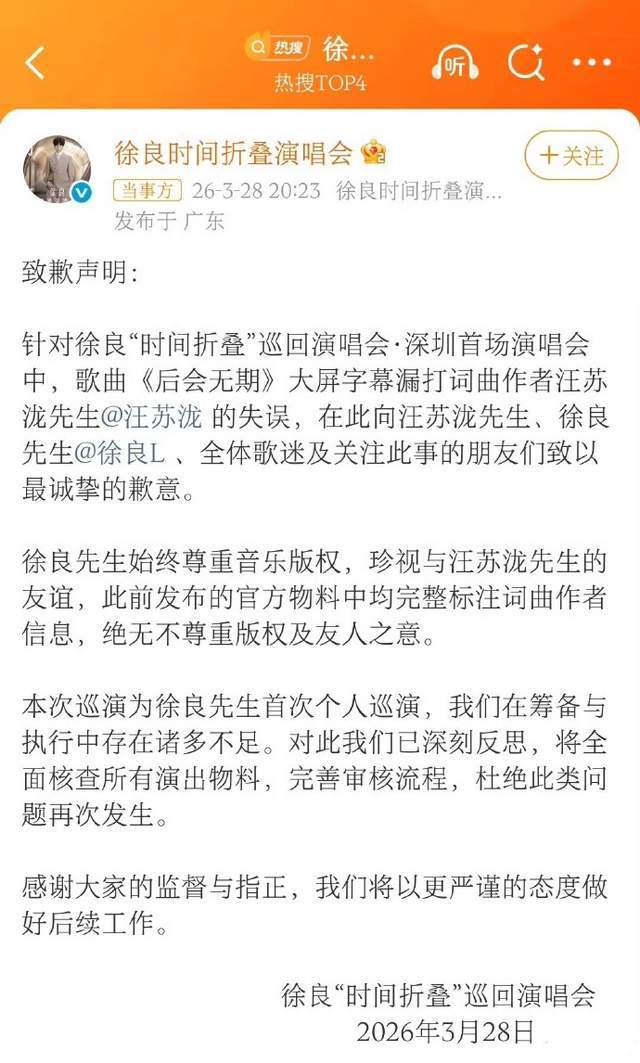 3月28日,@徐良时间折叠演唱会 发了一封致歉声明。没有推诿,没有甩锅,直接定性:漏打署名,我们的错。向汪苏泷道歉,向歌迷道歉,承诺全面核查物料。