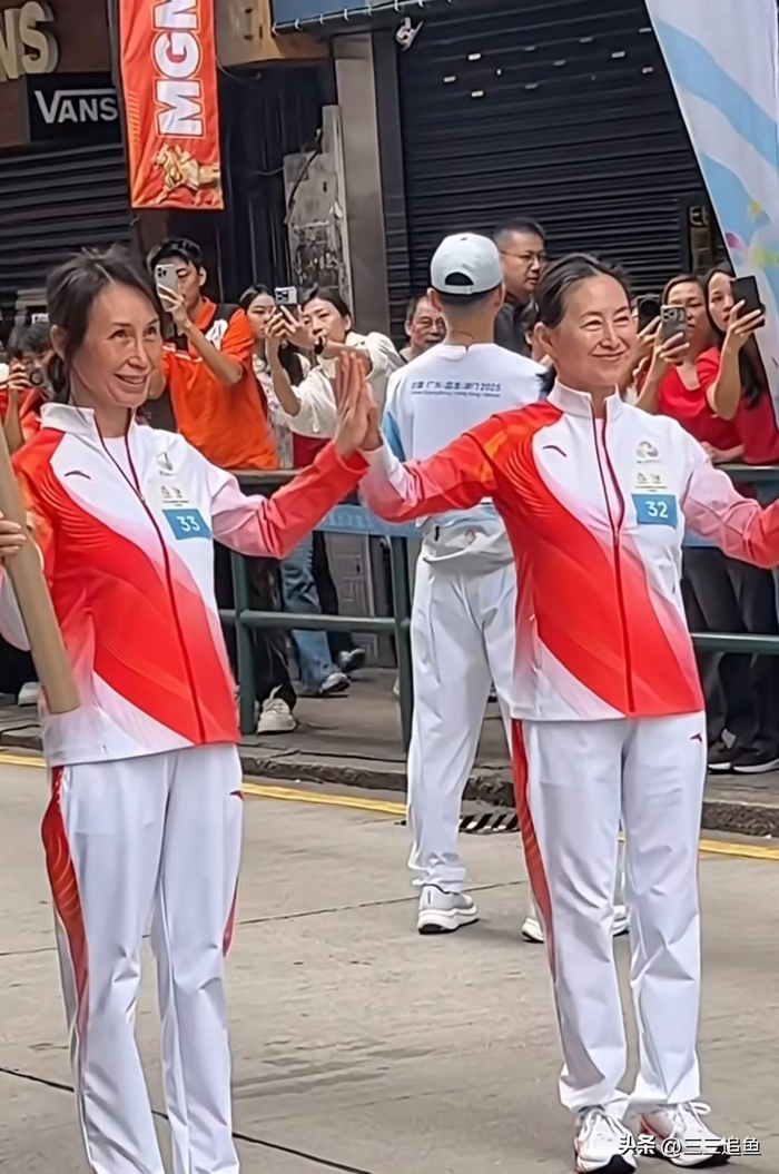 现场还出现了姐妹同框的温馨画面——妹妹何超凤作为下一棒火炬手登场。何超凤同样素颜亮相,扎着与姐姐相似的低马尾,穿着正式而低调。两人在击掌合影时,看得出对这次活动都非常重视。
