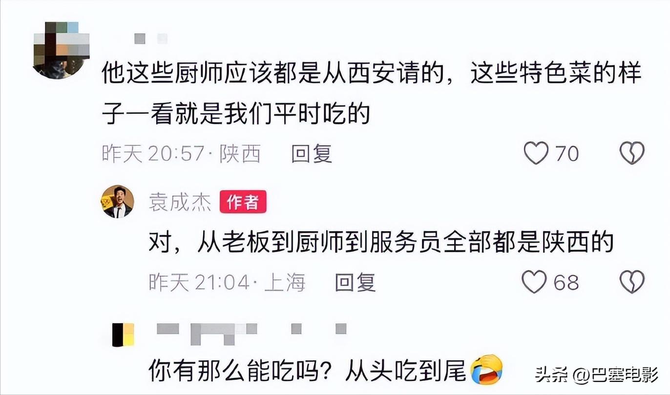 不少网红明星都去到店里打卡,比如上海本地明星袁成杰。据他所说,文章店里从老板到厨师到服务员全都是陕西的。