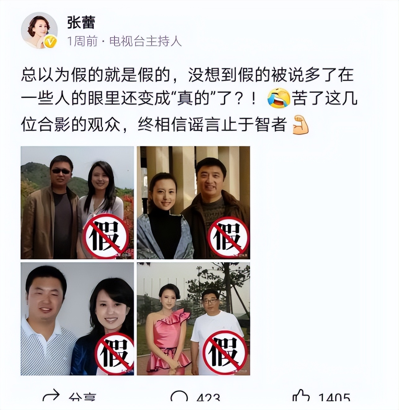 某个营销号截取了一张她和四位男同事的合照,配上耸人听闻的标题,声称这四个人都是她"包养"的对象。