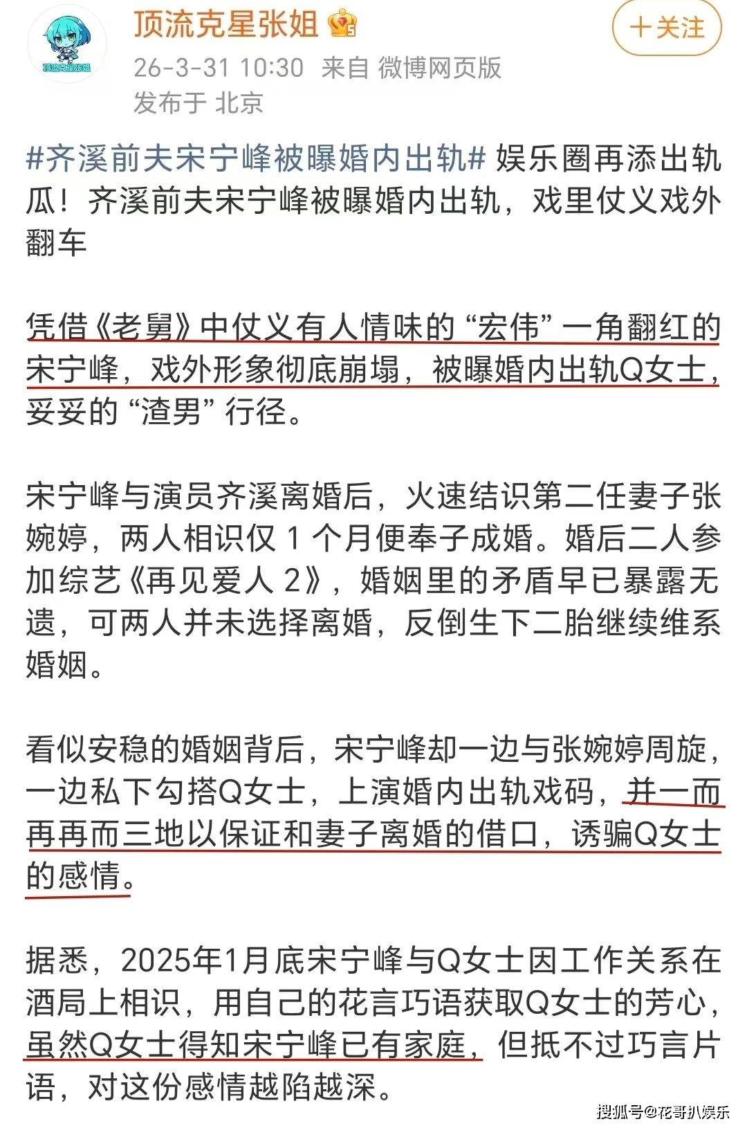3月31日有媒体曝光,宋宁峰在婚内出轨一位Q姓女子,这段不正当关系已经持续了一年多的时间,在此期间,他多次向小三承诺,会尽快与妻子张婉婷离婚,而这位小三也明知对方已有家室,却依旧知三当三,都不是啥好玩意。
