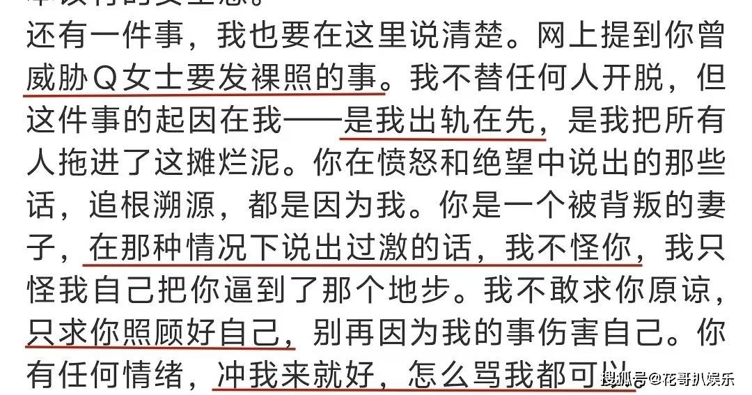 到了文末,他还表示自己会去看心理医生,将自己的过错归咎于心理问题。心理有问题,下半身没问题,还能和小三干点不该干的,真是薛定谔的心理问题。