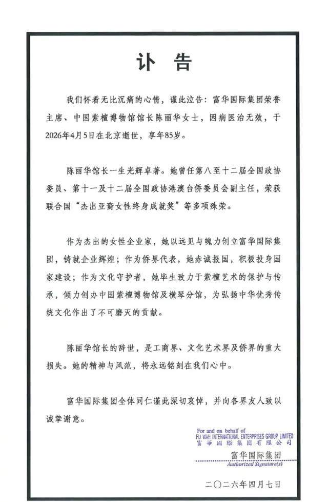 公开资料显示,陈丽华是香港富华国际集团董事局原主席,而她的身家也是达到了百亿(2026年显示是470亿),不过集团的事务基本上交给了儿子打理,至于老公迟重瑞则与她一起专注于紫檀馆。