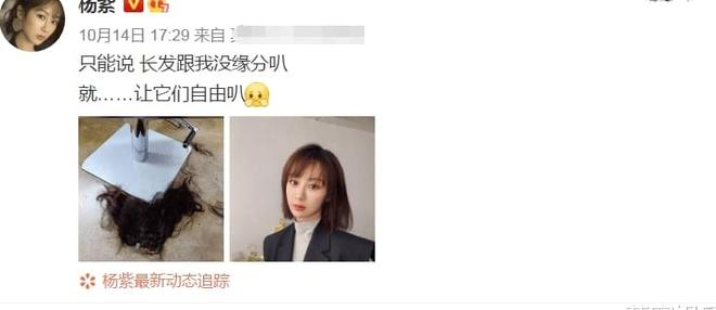 但是杨紫呢似乎这次剪了头发并不是很开心,因为她这回的配文是:只能说,长发跟我没缘分叭,就让它们自由叭。