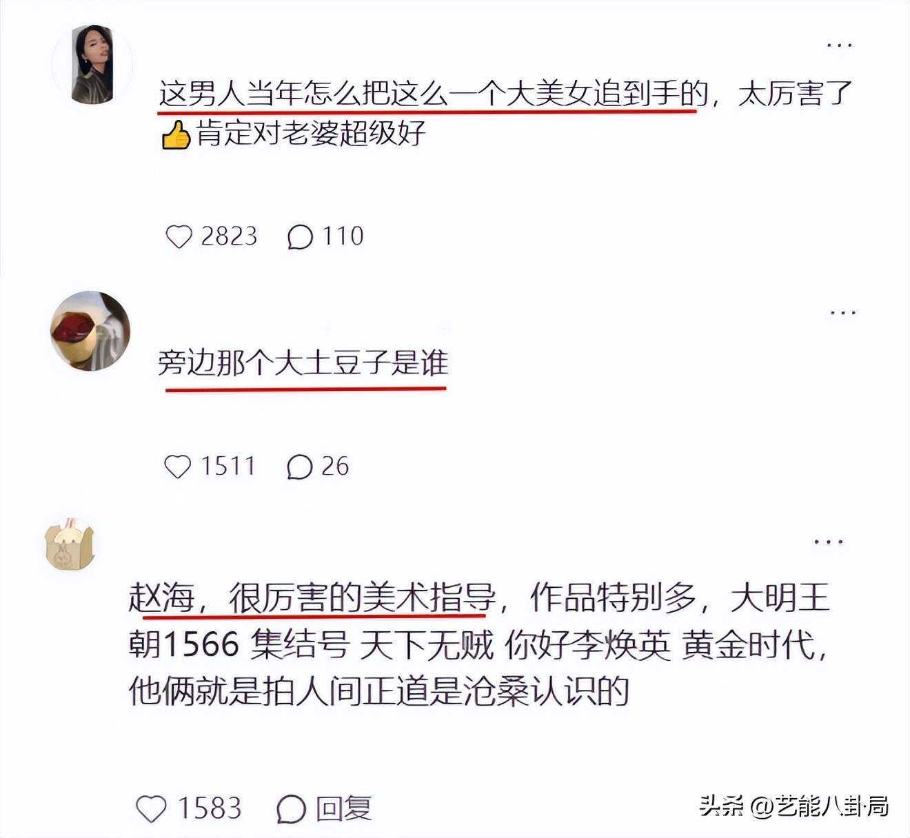 谁能想到,这个被网友吐槽颜值的男人,其实是业内公认的美术指导大牛,他的履历包括张艺谋的《有话好好说》、冯小刚的《集结号》、张黎的《人间正道是沧桑》、许鞍华的《第一炉香》……说是作品等身也不为过。果然得是这么有才华的男人,才能娶到大美女。听完讲解的杨雪,忍不住又在赵海的脸上印了好几个香吻。