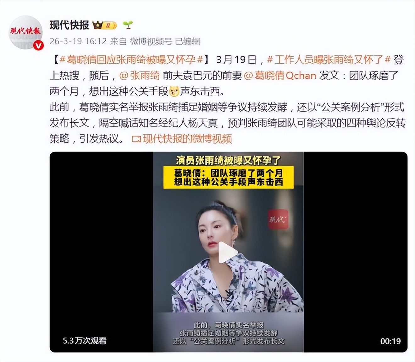 3月19日,一则关于“张雨绮怀孕”的消息强势登顶热搜第一。