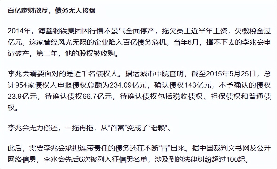 2014年6月,李兆会正式申请破产。
