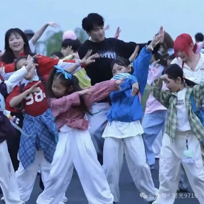 只见林依轮穿着黑卫衣牛仔裤,一个人带着一群小孩,在湖边边唱边跳。
