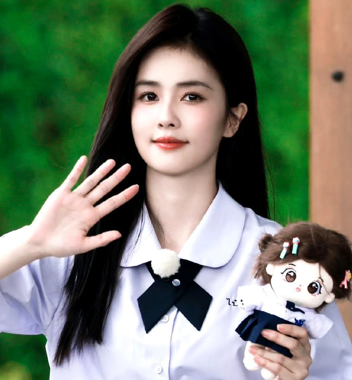 嘴角抿起来上扬,黑长直看起来既乖巧又可爱,梦回出道时期的青春校园感。