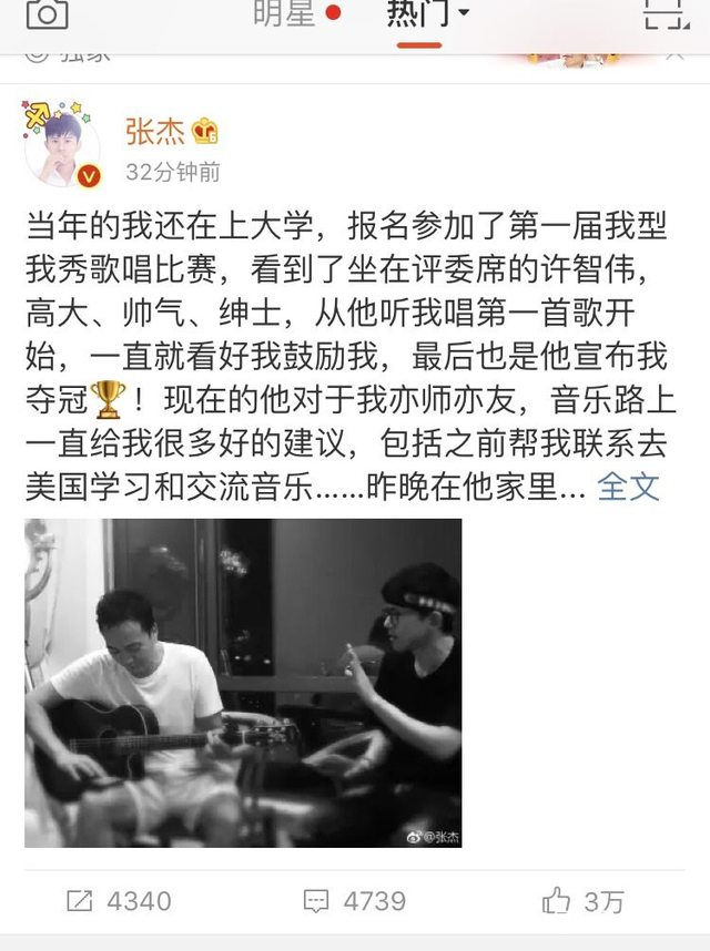 今天张杰发微博称:当年的我还在上大学,报名参加了第一届我型我秀歌唱比赛,看到了坐在评委席的许智伟,高大、帅气、绅士,从他听我唱第一首歌开始,一直就看好我鼓励我,最后也是他宣布我夺冠!现在的他对于我亦师亦友,音乐路上一直给我很多好的建议,包括之前帮我联系去美国学习和交流音乐……昨晚在他家里,我们聊起当年比赛时的情景……他弹吉他,我们一起唱,勾起了很多曾经的美好回忆。