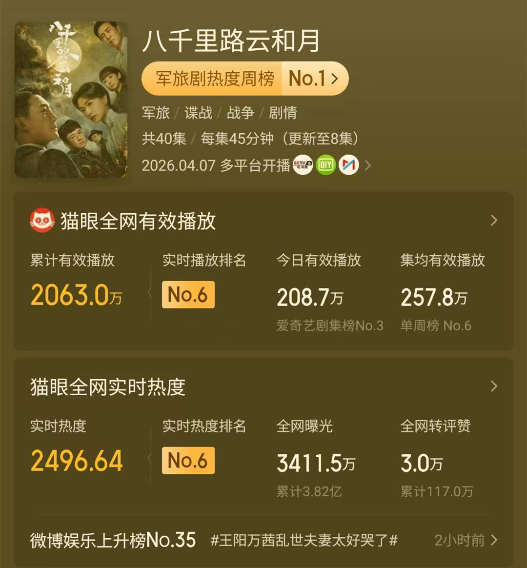 展开全文截至目前,电视剧《八千里路云和月》的累计有效播放数字是2063.0万,集均是257.8万。面对这样的累计有效播放数字和集均数字,我们就不要拿播放数字高的电视剧进行对比了,我们只拿一部被观众们广泛批评为扑街的《冰湖重生》进行对比吧。对比之前,明确一点,《冰湖重生》比《八千里路云和月》还要晚一天上线,截至目前,该剧的集均已经实现251.2万。一部所谓的大剧,眼看着连《冰湖重生》这类烂俗戏都“打不过”了,真的不应该。