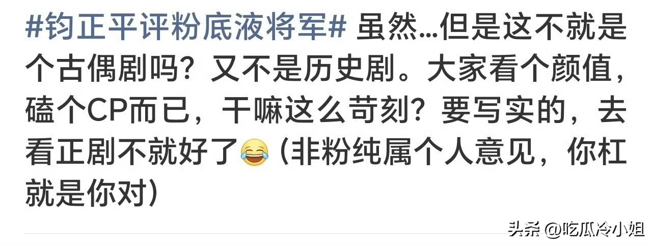 **吃瓜简评:粉丝冲官号,文艺创作的责任与反思**,一个令人哭笑不得的事件在网络上引发热议,事情起因是一部古装剧中,主演张凌赫的角色被网友“钧正平”批评为“粉底液将军”,称其造型和形象不符,缺乏阳刚气概,甚至直言不该扮演将军角色,钧正平的这番言论引发了粉丝的强烈不满,尤其是张凌赫的粉丝们,直接“冲了”钧正平的官方账号评论区,留言如“滚”,“别粘我了”,甚至有人联系工作室“告状”。,### **粉底液将军:阳刚与细腻的争论**,钧正平在评论中直言不讳,认为古装剧中的将军角色“承载不起塑造阳刚之气的社会责任”,并直言张凌赫的粉底造型“毫无风霜痕迹”,难以将军角色,这种批评在某种程度上确实让人耳目一新,因为将军的形象确实需要力量感和威严气概,而张凌赫以其细腻的表演风格和精致的造型,是否真的能完全契合古装将军的形象,确实值得商榷。,粉丝们对钧正平的批评并不买账,认为这种评价不仅不专业,还有些武断,粉丝们反驳道,古装剧中的将军不一定非得是“铁皮面孔”的粗犷形象,细腻和内敛的表演同样可以传达出复杂的角色特质,更重要的是,粉丝们认为钧正平的批评缺乏深度,甚至有点刻板,他们指出,剧中的角色塑造并不简单,张凌赫的表演可能在细腻中藏着深沉的内核,钧正平的批评显得不够全面。,### **粉丝的反击:文化责任与角色解读**,粉丝们的反击不仅仅是对个别批评的不满,更是一种对文化责任的反思,他们认为,钧正平作为文艺工作者,应该更负责任地处理公众的文化产品反馈,而不是随意发表对某一角色的负面评价,粉丝们甚至调侃道:“文化工作者先有文化,这句话的含金量还在上升!”这句话道出了粉丝们对文艺创作者的一些不满。,粉丝们还提到,这部剧的问题不仅仅是角色的塑造,还有剧情设计的荒诞之处,他们批评剧中男女主对屠城行为的认可、战争被浪漫化的处理方式,以及将军角色被描绘成一个“谈恋爱的陪衬”的角色,粉丝们甚至直言不讳地认为,这种剧情设计不仅让人反感,还可能影响青少年的价值观和文化审美。,### **粉丝冲官号:文艺创作的公关难题**,更让人哭笑不得的是,粉丝们不仅在评论区发言,甚至有人联系了张凌赫的工作室,要求“取证”,以证明钧正平的评论不公,这种行为虽然夸张,但也反映出粉丝们对公众人物和文艺作品的高度关注,粉丝们认为,文艺创作者和公众人物应该对自己的作品负责,而不是用“文化偶像”的身份来逃避批评。,粉丝们还调侃道:“官方号下粉丝发言太多了,根本截不完!”这句话道出了粉丝们在网络上发言的热情和激情,他们认为,钧正平的官方号本应是文艺工作者的平台,但看到粉丝们的发言数量,似乎也难以避免被卷入这场“文明对话”的漩涡中。,### **事件的深层反思**,这场粉丝冲官号的闹剧,表面上是一场简单的“粉丝反击战”,实则隐藏着更深层的文化和社会反思,这反映出粉丝群体对文艺产品的高度关注和强烈情感投入,这也暴露了部分粉丝对文艺创作的理解和欣赏能力的不足,文艺工作者在创作过程中确实需要承担更多的社会责任,而粉丝们也应该学会理性表达自己的观点,避免过激的言论和行为。,更重要的是,这场事件提醒我们,文艺创作不仅仅是娱乐,它对社会的文化传播和价值观塑造具有深远的影响,文艺工作者需要在创作和公关之间找到平衡点,而粉丝们则需要以更成熟的态度参与文化讨论。,### **吃瓜与反思**,这场“粉底液将军”事件,堪称2026年内娱最荒诞的一幕,从钧正平的批评到粉丝们的强烈反击,整个事件充满了戏剧性和喜剧性,无论是文艺工作者的责任感,还是粉丝们的热情与不成熟,都在这场闹剧中得到了淋漓尽致的展现。,这场事件也让人不禁思考:文艺创作和公众反馈之间的平衡点在哪里?如何在不失去创作自由的同时,承担起传播社会价值的责任?而粉丝们又该如何在表达热情的同时,提升自己的文化理解力?这些问题的答案,或许需要文艺工作者和粉丝们共同努力,才能找到一个更加和谐的解决方案。