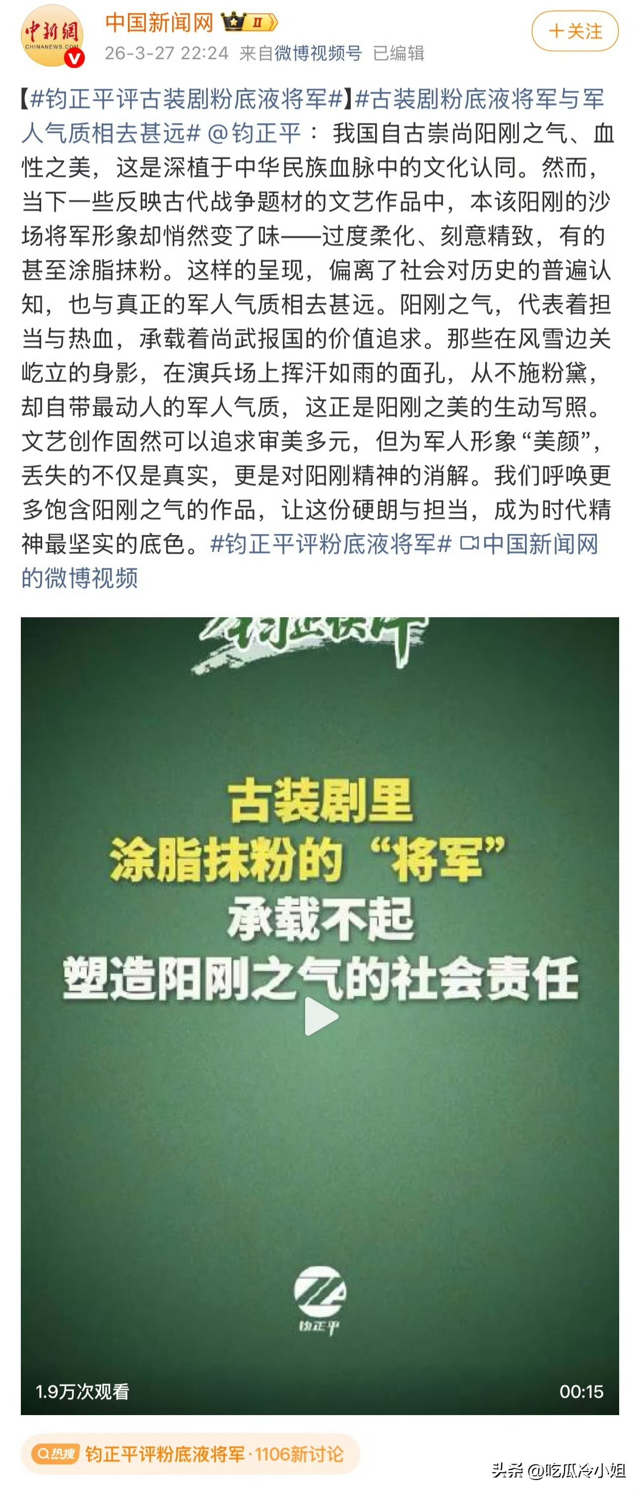 3月28日报道,钧正平官方号昨天发文锐评粉底液将军!称古装剧里涂脂抹粉的“将军”,承载不起塑造阳刚之气的社会责任!不仅钧正平发文批评,中国新闻网也发了,还有浙江宣传也批评粉底液将军。上钧正平号还直接带了逐玉tag...... 这下真凉了吧!