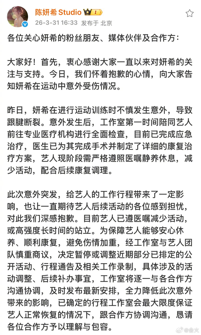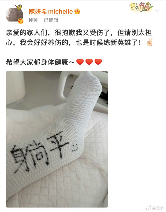 #陈妍希跟腱断裂受伤#