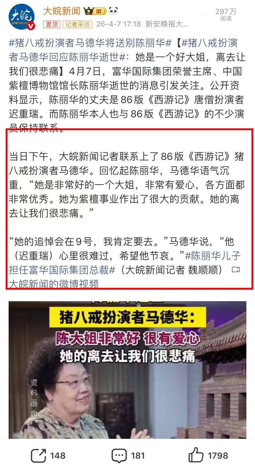 陈丽华去世的消息冲上了热搜,因为公司发布了讣告,曾在《西游记》饰演唐僧的迟重瑞先生也发布了讣告。富华国际集团荣誉主席、中国紫檀博物馆馆长陈丽华女士因病医治无效,于2026年4月5日在北京逝世,享年85岁 。