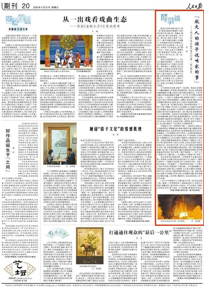 演员、导演吴京在4月22日出版的《人民日报》副刊版撰文《“航天人的孩子说咱家的事”》。