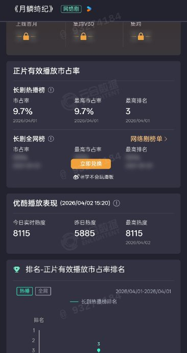 首日(4月1日):市占率9.7%,空降榜单第三位,预估单日播放量约2050万-2747万;