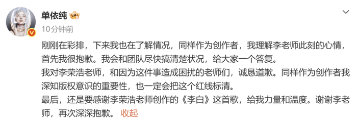 我对李荣浩老师,和因为这件事造成困扰的老师们,诚恳道歉。同样作为创作者我深知版权意识的重要性,也一定会把这个红线标清。