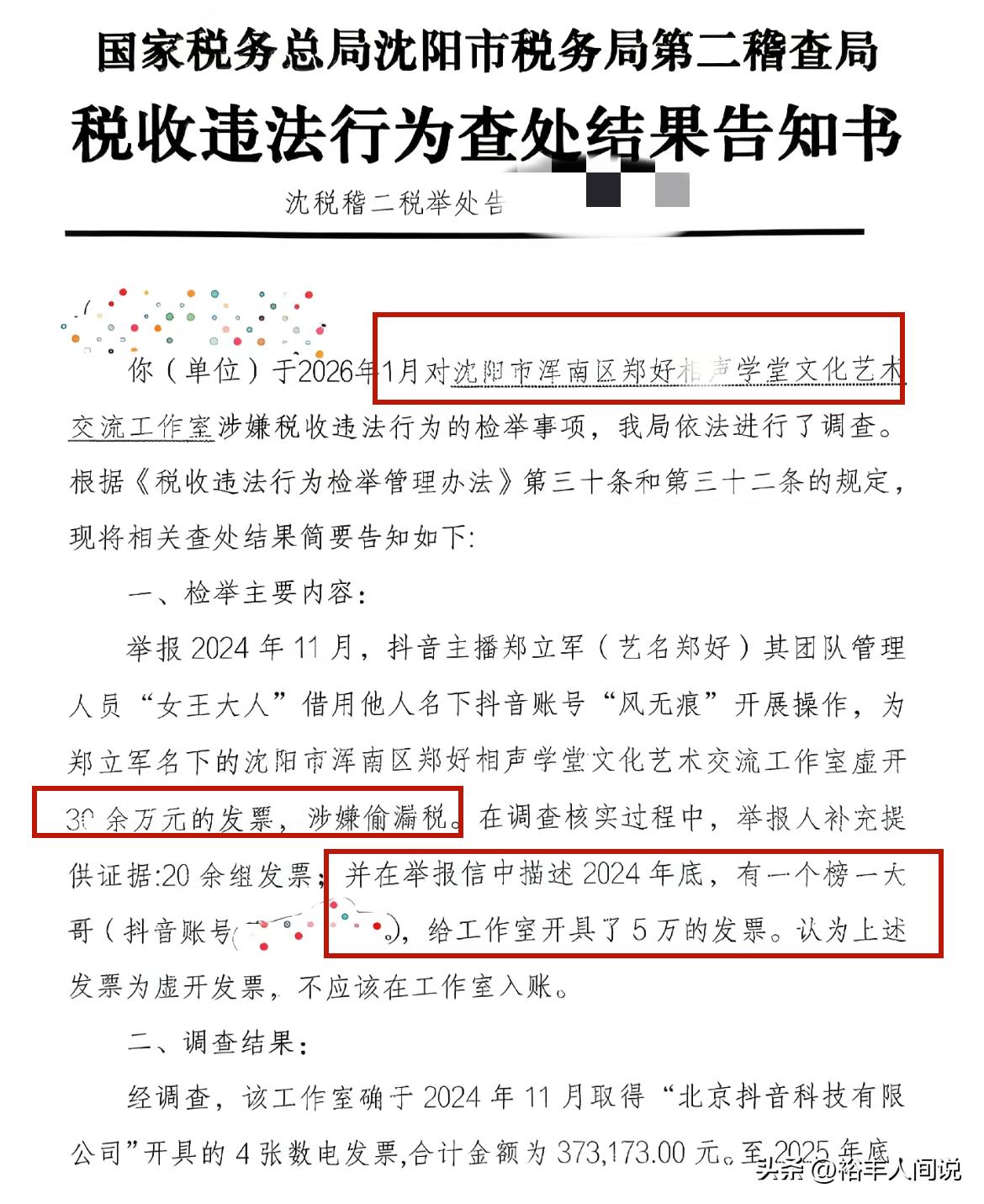 前德云社艺人戴九安在小号上公开分享了一则税收违法查处结果告知书,上面显示的内容便是郑好于沈阳成立的工作室。