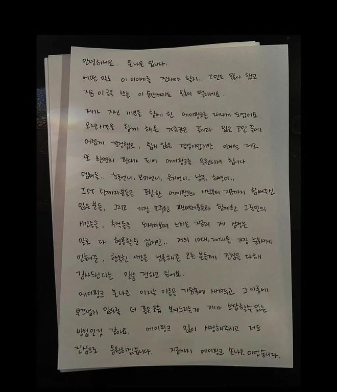队长初珑也在Apink官方IG PO出亲笔信:「Panda们应该很惊讶很受伤吧,真的很对不起...... 上次特别专辑之后,所有成员一起对Apink的未来做了很多思考和讨论。成员们一起走过了10年时间、分享过幸福的时刻,所以现在这瞬间我们也仍然没有实感。」