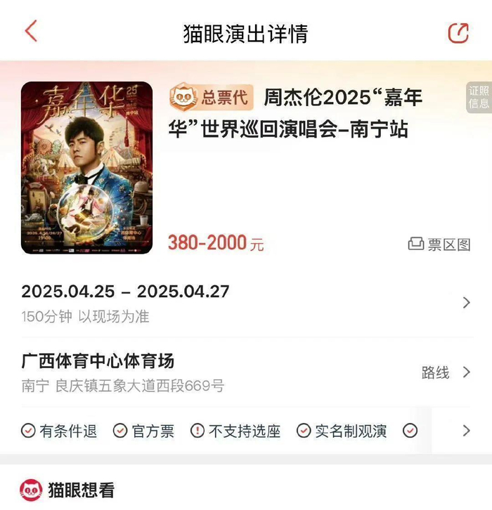 此次南宁站演唱会 4 月 25 日开场,连办 3 天,门票价格在 380 元至 2000 元之间,满足各消费层级歌迷需求。平台数据表明,超 500 万人已早早点亮 “想看”,足见歌迷热情爆棚。开票之际,抢购页面瞬间被狂热浪潮淹没,歌迷皆成 “手速达人”,狂点购买按键。其中 380 元与 480 元票档的特价大屏观演区,虽视线受阻,却似被施魔法般抢手,开售即飞速售罄,令众多未抢到票者懊悔不已。猫眼平台工作人员称,该大屏观演区为视线遮挡区,仿若被无形纱幕遮蔽,即便带望远镜也难窥舞台全貌,只能借大屏幕感受氛围。即便如此,仍有歌迷因对周杰伦深爱,果断购票。有歌迷在社交平台兴奋留言:“能在现场嗅到周董气息,哪怕只看大屏幕,亦是幸福。”