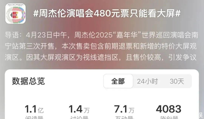 然而,这一特殊票档现身,引发诸多争议。“周杰伦演唱会480元票只能看大屏”话题迅速冲上热搜第一,成网友热议焦点。不少网友在评论区各抒己见,分成两种不同观点阵营。一部分网友觉得,有瑕疵区域低价售卖有一定合理性,平台售票时已告知视线问题,介意者可自主选择不买,如同购物明码标价,消费者有选择权。另一部分网友则难以理解,质疑做法合理性,认为即便提前告知,只能看大屏的观演区收480元票价仍过高,就像花买苹果的钱得苹果影子,服务质量与票价严重不匹配。