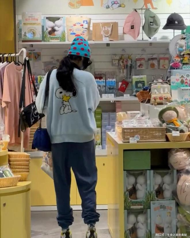 扎着利落马尾,头戴蓝色波点针织帽,一身蓝色卡通卫衣搭配同色系休闲裤,脚上踩着简约运动鞋,全身上下都是减龄感。