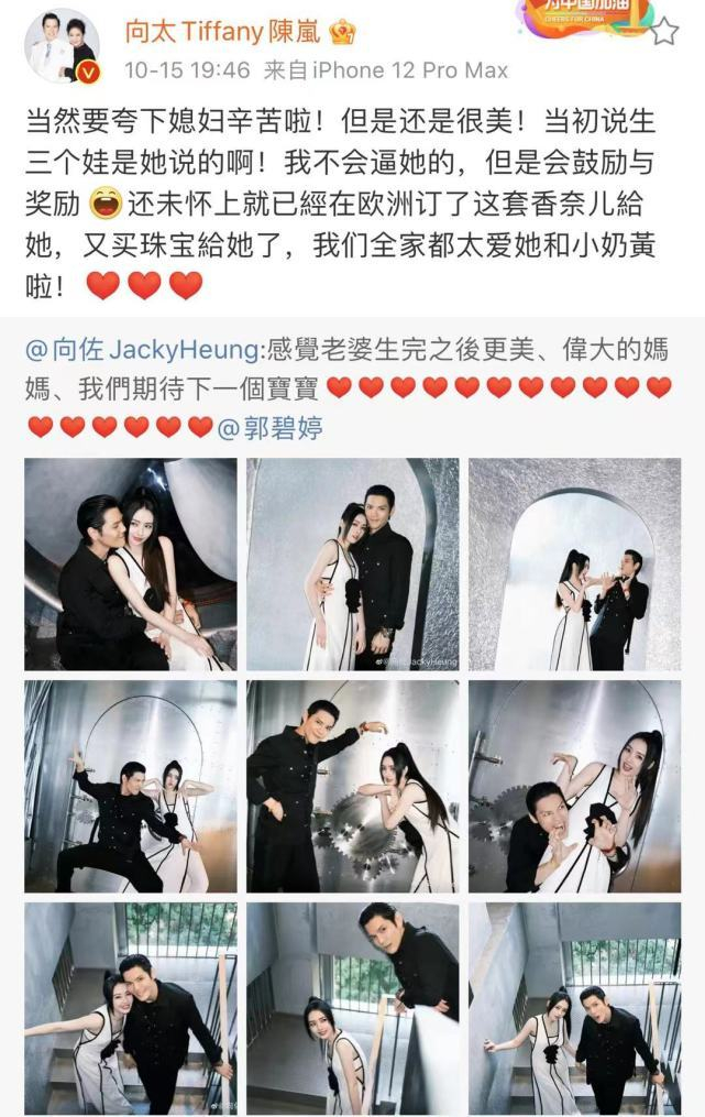 10月15号,向佐晒出一组自己跟妻子郭碧婷的写真照甜蜜撒糖,同时低调的官宣了郭碧婷怀上二胎的好消息,两人已经期待下一个宝宝了,换句话说,郭碧婷已经怀上二胎,两人正期待宝宝的到来。