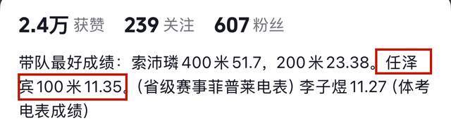 在这位老师的简介中,还特地标注了任泽宾的100米成绩为11.35秒。