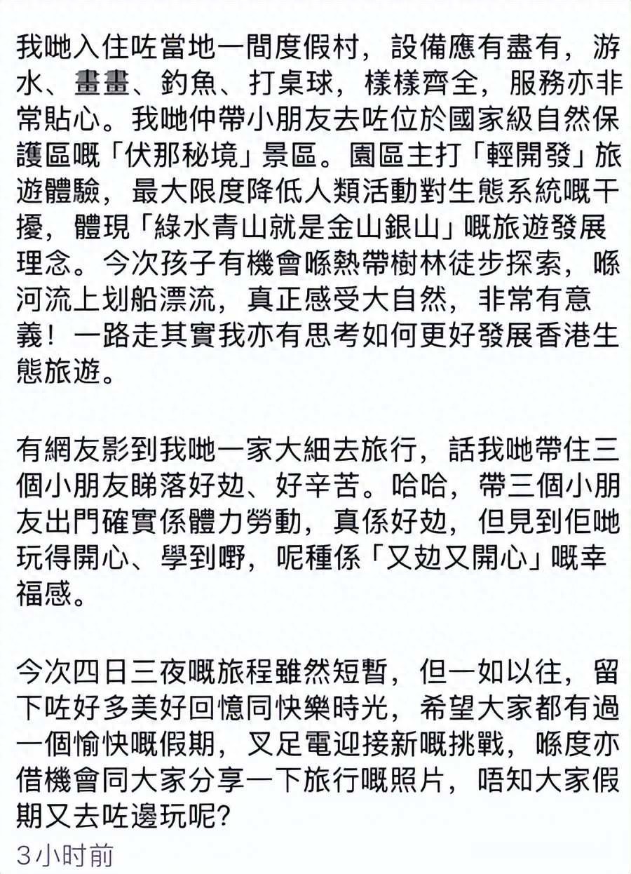 漂流时霍启刚随口说了一句,香港要是也有这种地方就好了,这话他没多解释,但结合三月香港教育局新出的户外学习指引,能看出他在想什么,孩子整天关在水泥森林里,连蚂蚁搬家都很少见,学自然课只能看图片,这次出门玩,连最小的妹妹都敢自己抓小鱼了。