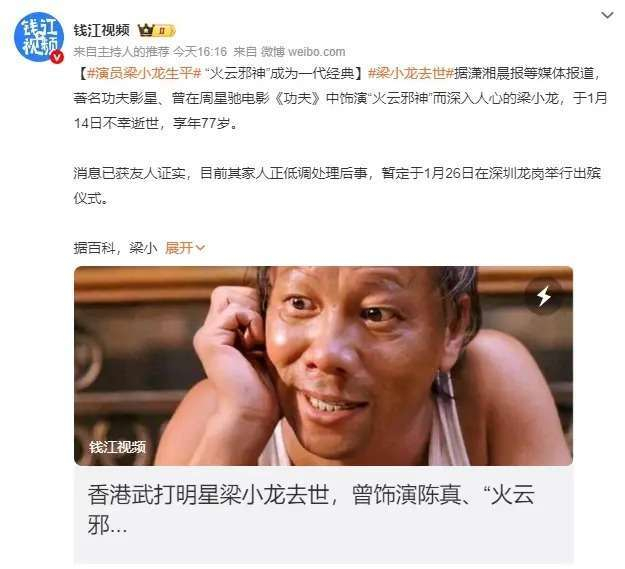 据潇湘晨报等媒体报道,著名功夫影星梁小龙于1月14日不幸逝世,享年77岁。他曾因在周星驰电影《功夫》中饰演火云邪神而成为家喻户晓的人物,令人印象深刻。这个消息已经得到了其友人的证实。目前,梁小龙的家人正低调处理后事,定于1月26日在深圳龙岗举行出殡仪式。梁小龙,1948年4月28日生于广东省中山市,是中国香港的男演员、武术家和武术指导。2004年12月,他参演了周星驰执导的电影《功夫》,并凭借火云邪神这一角色,凭借他标志性的蛤蟆功和深邃的眼神给观众留下了极为深刻的印象。