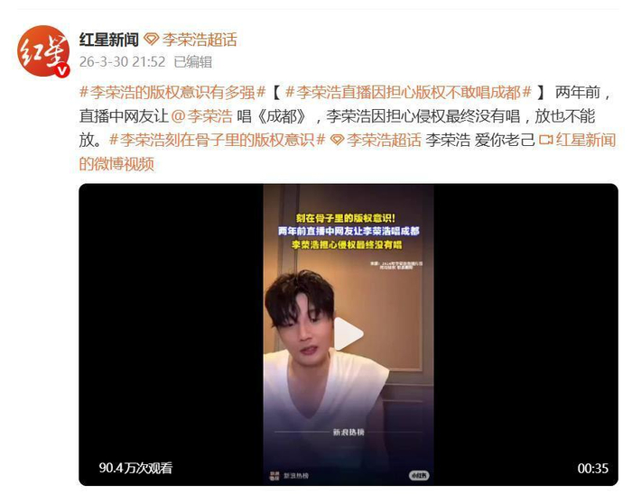 据3月30日晚间报道,歌手李荣浩因为一起版权维权事件被推上风口浪尖,而他两年前一次直播中的“自律”细节也被重新翻出,两者形成的强烈反差,让公众看到了一个将版权意识“刻进DNA”的艺人形象。