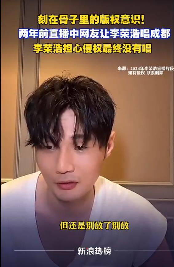 时间回到2024年的一次直播。当时,面对粉丝点唱赵雷的《成都》的请求,李荣浩没有立即满足,而是第一时间追问工作人员:“这个我们能播吗?有授权吗?”在得到“应该可以播放”的模糊回应后,他并未放松,反而反复质疑其合法性。在确认无法获得明确授权后,他毫不犹豫地秒速叫停了即将响起的伴奏,最终放弃了演唱。这一幕,被网友评价为“把谨慎写在了脸上”。