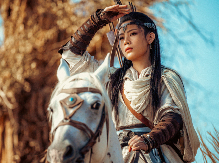 她饰演的阿育娅出场手持大漠弯弓,大喝一声:“擅动刀兵者,死”,随后百步穿杨,仿佛能一箭破万军的气势真是把吴京都给比下去了。