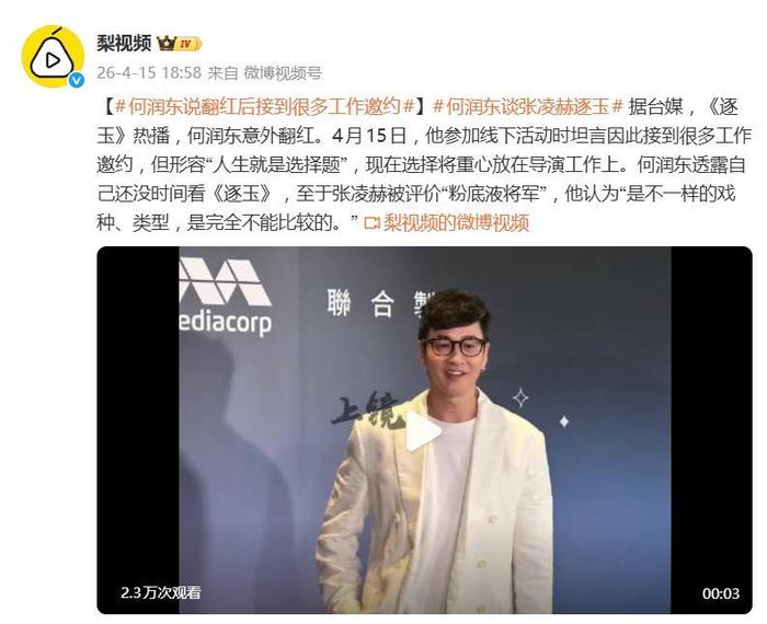 面对这波突如其来的热度,何润东本人的反应却相当“淡定”甚至有些“滞后”。4月15日,他在一次线下活动中坦言,因为翻红确实接到了很多工作,但他形容“人生就是选择题”,目前的选择是将重心放在导演工作上。更让人意外的是,他透露自己还没时间看当下正热播、并因此被网友拿来与他作对比的《逐玉》。对于《逐玉》中张凌赫的造型被部分网友评价为“粉底液将军”,何润东的回应显得很谨慎,他认为这是“不一样的戏种、类型,是完全不能比较的。”