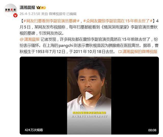 **吃瓜简评:扫墓遇到“回忆杀”,15年前就走的“李副官”**,4月5日,一则扫墓视频在网络上悄悄炸开了锅,直接把一众网友的纪念日程给打乱了,这场“回忆杀”来得相当及时,某网友发布的视频中,竟然找到了《情深深雨濛濛》中“李副官”曹秋根的墓碑,瞬间引发了一波热议,评论区更是炸开了锅。,“难以置信?”“15年前就走了?”“方瑜、秦五爷也走了?”这些评论一波波炸了出来,大家的第一反应都是在为自己之前的“记忆之洞”感到羞愧,记得那个忠诚、无私、令人心疼的“李副官”角色,光是想起他在剧中的表现,仿佛他才刚刚离我们不远,而不是15年前就离开了人世。,原来,这份迟来的集体追忆背后,是一个早已发生的告别,曹秋根于2011年10月18日凌晨,因胰腺癌在上海大华医院病逝,年仅58岁,同年10月22日,他的告别仪式在上海龙华殡仪馆银河厅举行,时光飞逝,至今已整整15年,这个消息一出,网友们的评论区充满了感慨与追思,有人联想到剧中其他已故演员,纷纷留言表达对逝者的缅怀。,这场因扫墓而引发的网络追忆,像是一次突然的“集体考古”,挖掘出了一个被大众忽略的往事,它不仅仅是一则关于一位演员离世的消息,更像是一面镜子,照见了经典角色如何长存于观众心间,而荧幕后的生命故事却可能静默地落幕,在信息飞速更迭的时代,这次意外的“发现”提醒着人们,别忘了那些曾用角色陪伴过我们青春的人。,这场“吃瓜”事件让我们不禁思考:那些在荧幕之外默默付出的演员,和他们留给我们珍贵的作品,是否也值得我们用同样的方式去纪念?在追忆经典角色时,是否也该想一想,陪伴过我们的人,当他们离去时,也该给予他们同样的关注与怀念?毕竟,真正的记忆,不仅仅是那些角色留给我们的伤感和感动,更是那些带着他们离去的生命故事。## 《荧幕之殇》,4月5日,一则扫墓视频在网络上投下了一枚"回忆杀"炸弹,某网友发布视频称,每年扫墓时都能看到电视剧《情深深雨濛濛》中"李副官"扮演者曹秋根的墓碑,瞬间引发热议,评论区一片震惊与唏嘘。,多么耳熟的面孔啊,那张瘦削的脸,总是带着几分慈祥,却又隐隐透着一丝悲怆,李副官这个角色,深深地印在了观众的心里,每当提到他,人们总会想起他在剧中的那一幕幕,想起他在困难中默默守护的身影,那时的年轻人,对演员的认识还不深,总是觉得演员和角色是分开的两个人,这大概就是命运的讽刺吧——在我们记忆中,李副官鲜活如初,而他的真实身影早已远去多年。,原来,这份迟来的大众知晓,背后是一个早已发生的告别,演员曹秋根于2011年10月18日凌晨,因胰腺癌在上海大华医院病逝,享年58岁,同年10月22日下午15:30,他的告别仪式已在上海龙华殡仪馆银河厅举行,时光飞逝,至今已整整过去了15年。,网友的评论里充满了对时光流逝的感慨与对一代人集体回忆的追思,有人联想到剧中其他已故演员,留言道:"方瑜那个演员也走了,怎么可能。"更有人发出叹息:"很多人去世是连个热搜都没有,悄无声息的走了。"一条总结性的评论更添伤感:"方瑜、李副官、秦五爷都去世了,真的很令人悲伤啊。",这场因扫墓而引发的网络追忆,像一次突然的集体"考古",挖出了一段被大众忽略的往事,它不只是一则关于一位演员离世的消息,更像一面镜子,照见了经典角色如何长存于观众心间,而荧幕后的生命故事却可能静默落幕,在信息飞速更迭的时代,这次意外的"发现"提醒着人们,别忘了那些曾用角色陪伴过我们青春的人。,我们在追忆这些已故演员的时候,或许也在追忆自己的青春,那些曾经深深地打动过我们的人,不一定都是广为人知的明星,他们可能只是默默地陪伴过我们一段日子,但正是这些普通中得不平凡的存在,让我们的生命之旅变得不一样,就像李副官在雨中孤独地守护着那个孩子,我们也曾是那个孩子,在他怀中找到了属于自己的光芒。,时光总是无情地流逝,但那些曾经让我们感动过、陪伴过的人和事,却永远停留在我们记忆的某个角落,就像曹秋根的墓碑,虽然被人们偶然发现,却始终静静地躺在那里等待被重新发现,或许,这就是生命的真谛——在不经意间,悄然绽放,久违finity。