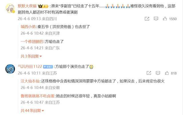 网友的评论里充满了对时光流逝的感慨与对一代人集体回忆的追思。有人联想到剧中其他已故演员,留言道:“方瑜那个演员也走了,怎么可能。”更有人发出叹息:“很多人去世是连个热搜都没有,悄无声息的走了。”一条总结性的评论更添伤感:“方瑜、李副官、秦五爷都去世了,真的很令人悲伤啊。”