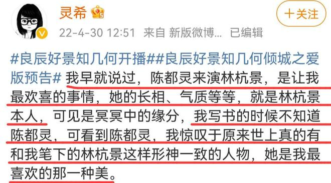 不过陈都灵却是《良辰好景知几何》原著作者心中的林杭景,也是她最希望能够出演林杭景的演员,第一次看到陈都灵的时候,她就觉得两人的神形很一致。
