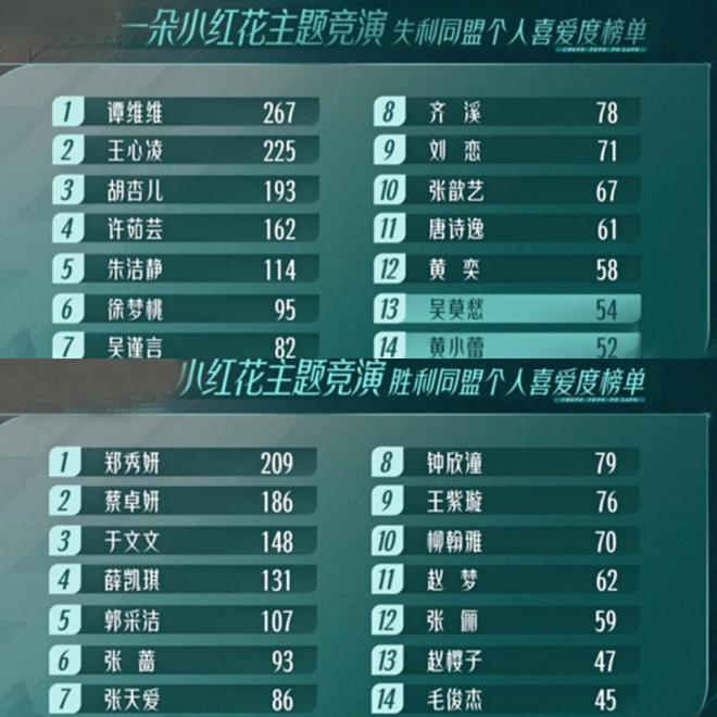 从两队人气排行中看出,姐姐们的人气两极分化,末位姐姐的人气还不如高人气姐姐们的零头,显而易见镜头也少得可怜。
