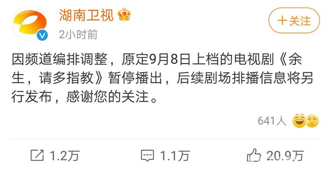 电视台与网络平台相继发出声明:因电视台频道编排调整,原定于9月8日上映播出的《余生,请多指教》,已确定延期,待播日期未定。