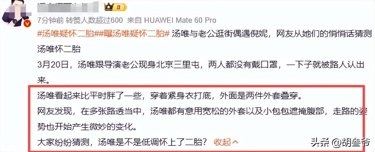 这起关于汤唯怀怀二胎的传闻引发了广泛关注,以下是事件的详细分析和可能的解读:,### 1. **汤唯与金泰勇的婚姻基础**,汤唯和韩国导演金泰勇的感情可以追溯到2014年的电影《晚秋》,两人因合作这部电影相识相知,低调步入婚姻殿堂,婚后,他们一直保持低调,但感情稳定,金泰勇为了支持汤唯的事业和家庭,长期定居北京,和汤唯一家三口过着安稳的生活。,### 2. **传闻的起源**,3月20日,汤唯和金泰勇在北京三里屯逛街,路人们拍下了他们的照片和视频,虽然两人没戴口罩,但更引人注目的是汤唯的身体状态,她看起来比以往圆润,贴身打底衫外面叠穿了两件宽松外套,走路时步子轻,腰腹位置用小包包或外套轻轻挡住,这一细节让路人猜测她可能怀上了二胎。,汤唯和倪妮的互动也被网友解读为内情的暴露,倪妮当天在三里屯有品牌活动,汤唯让助理通知对方,自己则混在粉丝群中等待,倪妮得知后,脸上惊讶,两人凑在一起耳语,倪妮随后低头看向汤唯的肚子,表现出惊喜的表情,虽然两人试图压低声音,但网友通过唇语解读倪妮问及怀孕的情况,汤唯点头回应。,### 3. **公众反应**,- **网友的猜测**:汤唯46岁,属于高龄产妇,网友普遍对她感到开心,同时也担心她的身体状况,汤唯一直注重保养,生活作息规律,身边有家人和医生的支持,预计孕期可以安心度过。,- **传闻的传播**:路人晒出与汤唯的合照,汤唯没有直接否认怀孕,只是通过表情和动作暗示,这些不遮掩的表现让传闻更具可信度。,- **倪妮的反应**:倪妮的行为被认为是“实锤”,她本能地保护汤唯,进一步支持了怀孕的传闻。,### 4. **事件的意义**,- **汤唯的职业生涯**:汤唯近年来工作较少,2026年开年至今没有官宣新项目,生活状态的变化引发了外界的猜测,如果确实怀二胎,她的职业发展可能会有新的安排。,- **公众形象**:汤唯一直以实力派女星形象示人,此次传闻可能进一步巩固她的家庭女性形象,同时也带来更多的关注和支持。,- **婚姻观的传播**:汤唯曾公开表示,父母排第一,丈夫排第二,女儿排第三,她的婚姻观和家庭观念值得关注,尤其是她强调伴侣的重要性,这与传闻中金泰勇的支持和陪伴高度契合。,### 5. **可能的真相**,- **官方消息**:如果汤唯确实怀孕,预计会在未来确认消息,但目前没有官方消息,所有信息均来自网友的解读和传闻。,- **误传的可能性**:部分细节可能被放大或误传,例如倪妮的互动可能被过度解读,或者汤唯的生活状态被误以为有怀孕征兆。,### 6. ***,这起传闻反映了公众对明星生活的关注点,也揭示了明星家庭生活的复杂性,无论真相如何,汤唯和金泰勇的感情和家庭生活都值得尊重,希望他们能够迎来更多的幸福时刻。