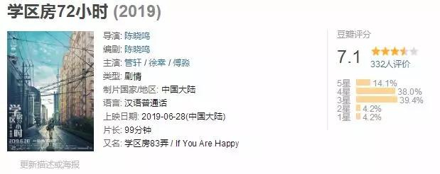 《学区房72小时》的口碑还不错,目前豆瓣评分为7.1分,三星及以上好评超91%,对于一部国产剧情电影来说,这成绩不赖。